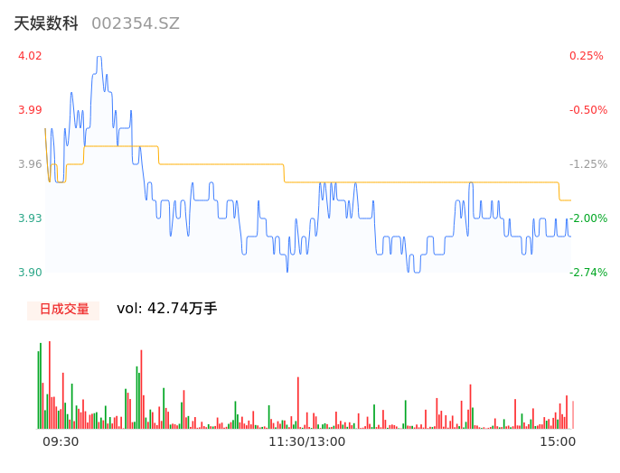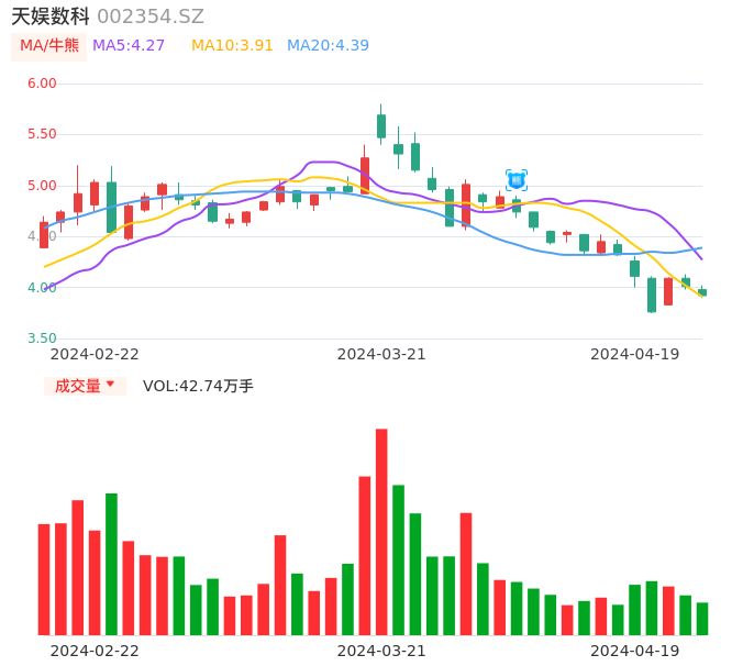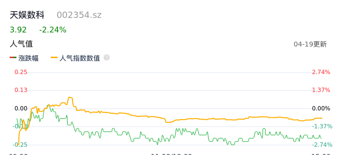 04月19日,天娱数科收报3.92,股价涨幅-2.24%,成交金额1.69亿元,换手率2.64%。