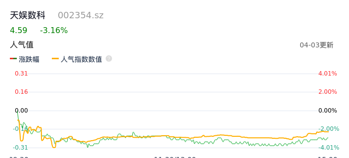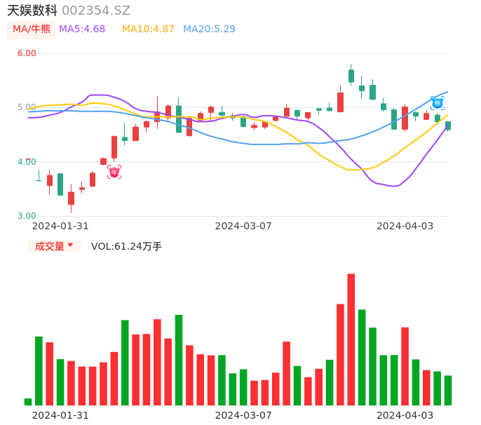 04月03日,天娱数科收报4.59,股价涨幅-3.16%,成交金额2.82亿元,换手率3.78%。