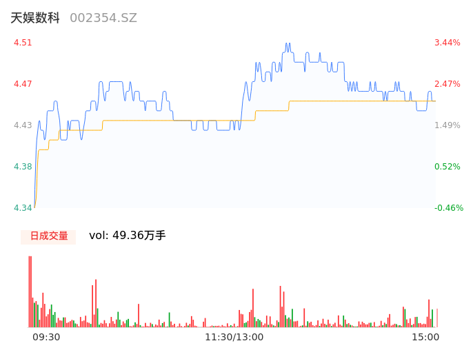 04月11日,天娱数科收报4.45,股价涨幅2.06%,成交金额2.20亿元,换手率3.05%。