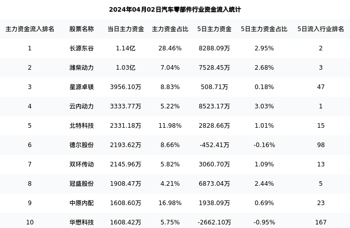 从主力资金流向来看,汽车零部件行业今日主力资金流入108.89亿元,在所有申万二级行业中排名:19/131。