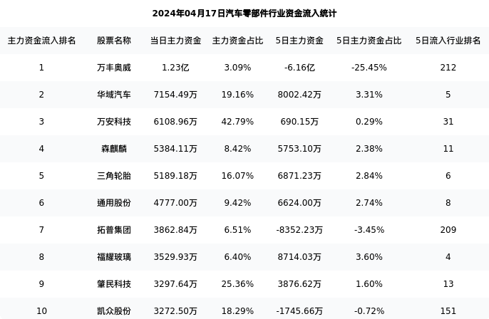 从主力资金流向来看,汽车零部件行业今日主力资金流入89.52亿元,在所有申万二级行业中排名:120/131。