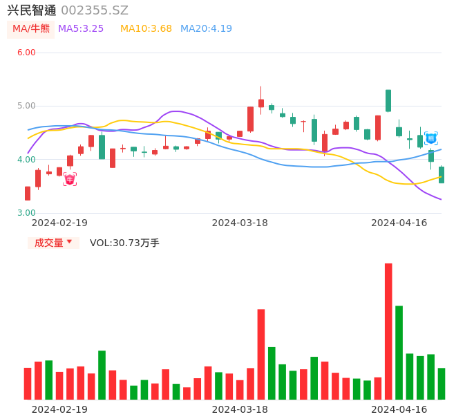 04月16日,兴民智通收报3.56,股价涨幅-10.10%,成交金额1.12亿元,换手率4.98%。