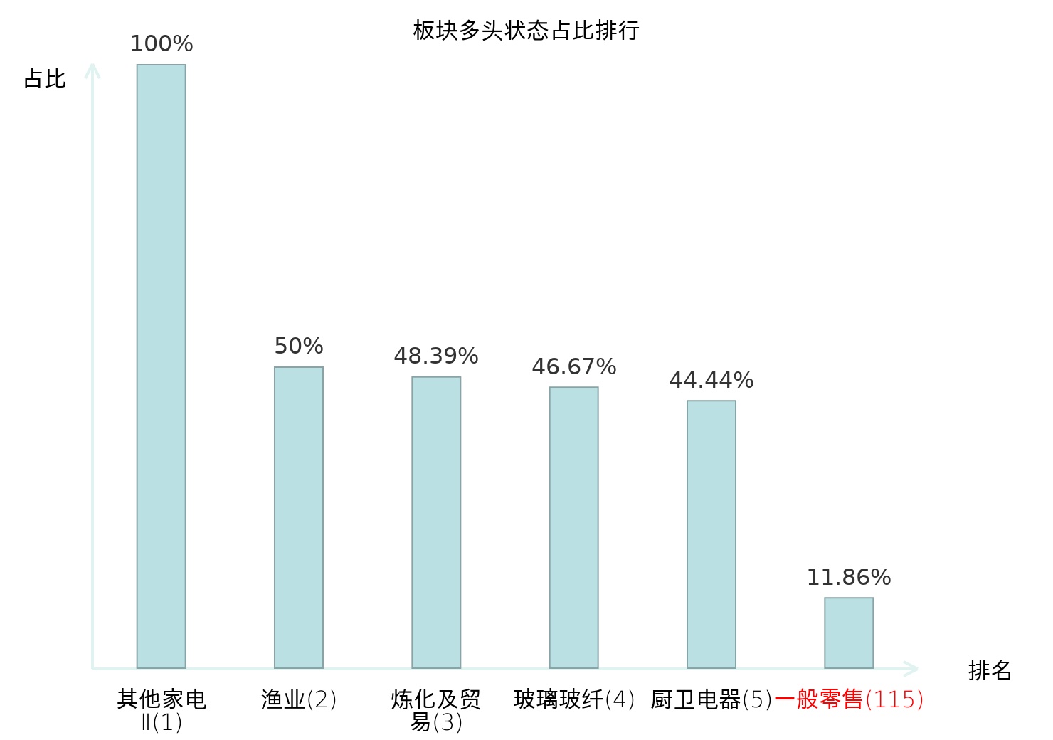 全市场所有行业板块中主力多头状态占比排名中,其他家电Ⅱ板块位居第一。冶钢原料板块名次提升最快,较昨日上升67位。