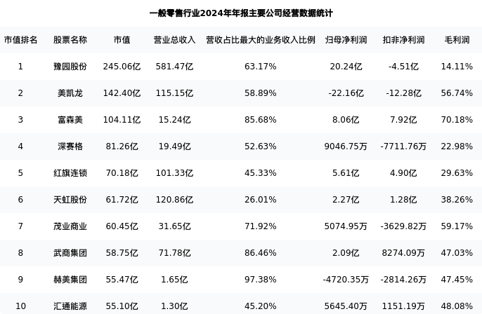 赫美集团最新报告期数据为年报,下表汇总了一般零售行业内市值靠前的公司年报主要经营数据