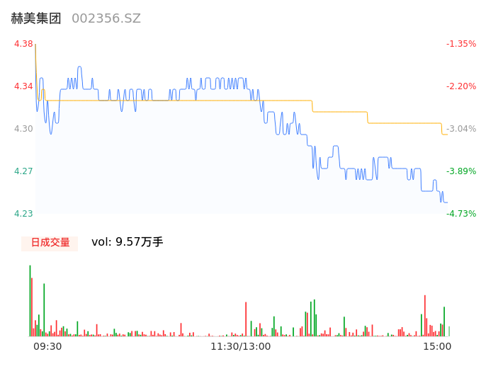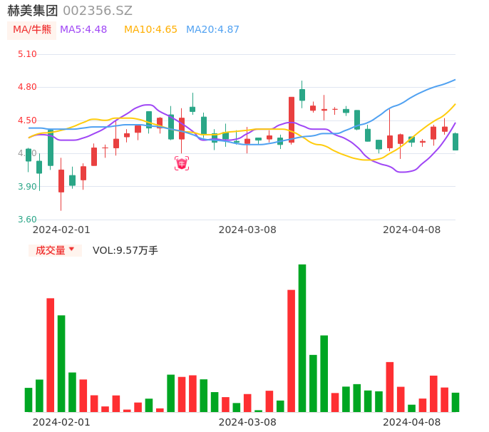 04月08日,赫美集团收报4.23,股价涨幅-4.73%,成交金额4115.14万元,换手率0.73%。
