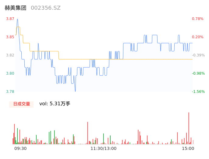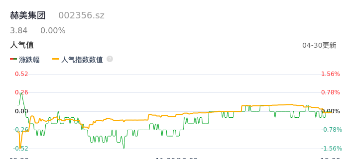 04月30日,赫美集团收报3.84,股价涨幅0.00%,成交金额2031.28万元,换手率0.41%。