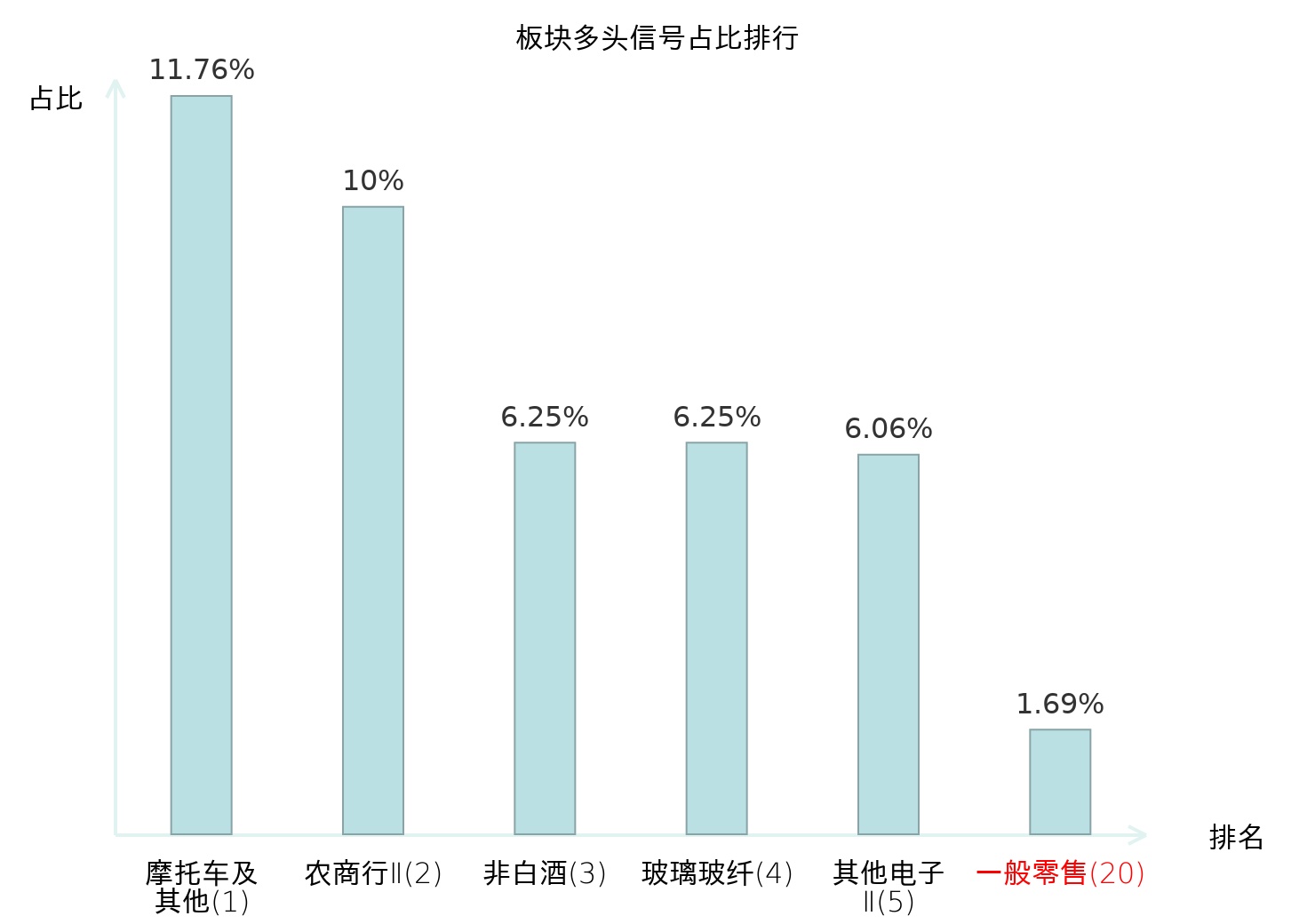 全市场所有行业板块中主力多头信号占比排名中,摩托车及其他板块位居第一。摩托车及其他板块名次提升最快,较昨日上升91位。