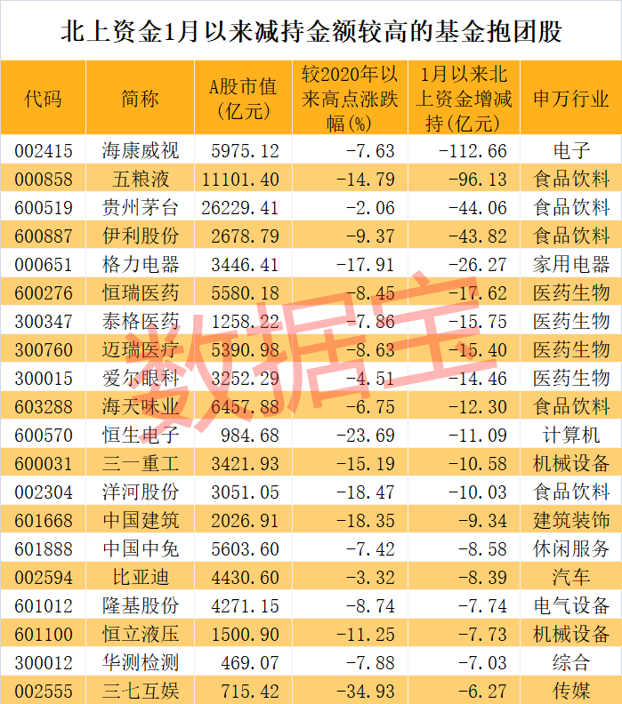 月初持续活跃的北上资金近日开始放缓节奏,近3个交易日连续呈现净卖出状态,合计净卖出额超110亿元。从1月至今,已有不少基金抱团的白马股遭到北上资金撤离。数据宝统计显示,按照区间成交均价粗略计算,北上资金净卖出超亿元的基金抱团股有44只,海康威视遭北上资金净卖出额约112.66亿元排在首位。两大市值万亿级消费股五粮液、贵州茅台遭北上资金净卖出额排在第二、第三位,北上资金净卖出额较大的还有伊利股份、格力电器、恒瑞医药、泰格医药、迈瑞医疗等。