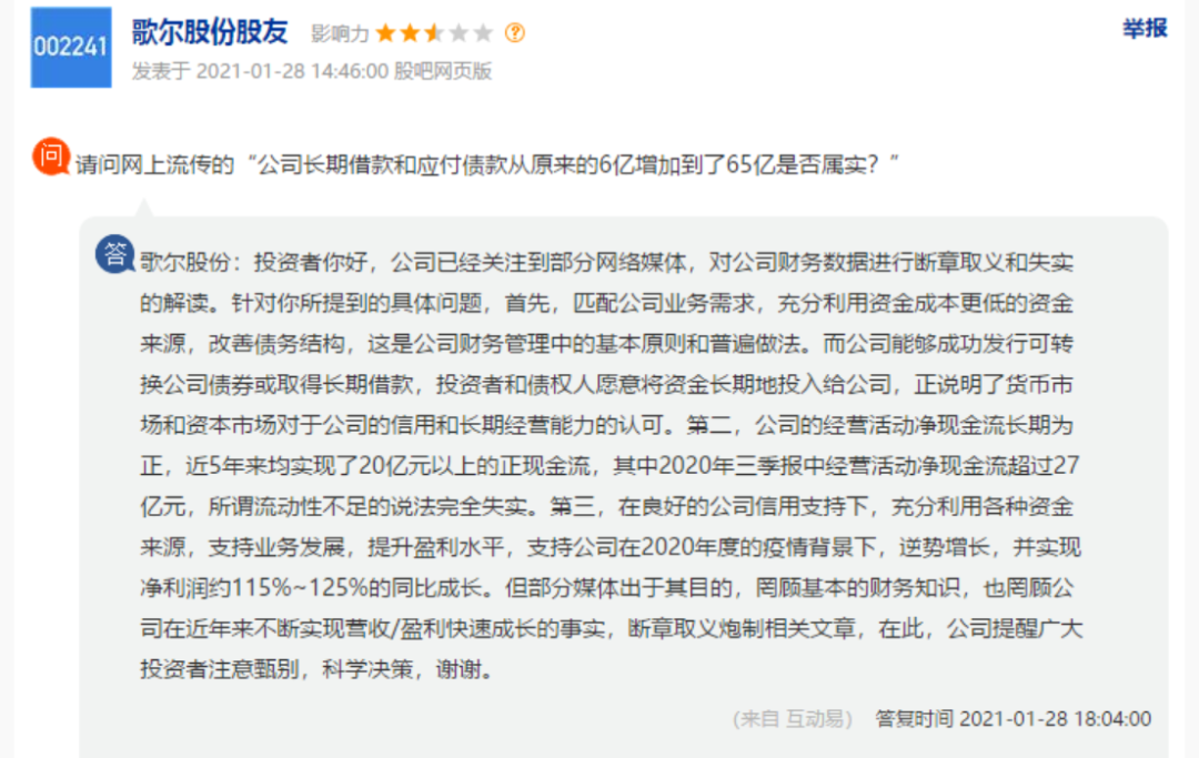 在昨日晚间,公司还在互动平台上对“长期借款和应付债款从原来的6亿增加到了65亿是否属实?”进行回应。歌尔股份表示,公司能够成功发行可转换公司债券或取得长期借款,投资者和债权人愿意将资金长期地投入给公司,正说明了货币市场和资本市场对于公司的信用和长期经营能力的认可。此外,公司的经营活动净现金流长期为正,近5年来均实现了20亿元以上的正现金流,其中2020年三季报中经营活动净现金流超过27亿元,所谓流动性不足的说法完全失实。