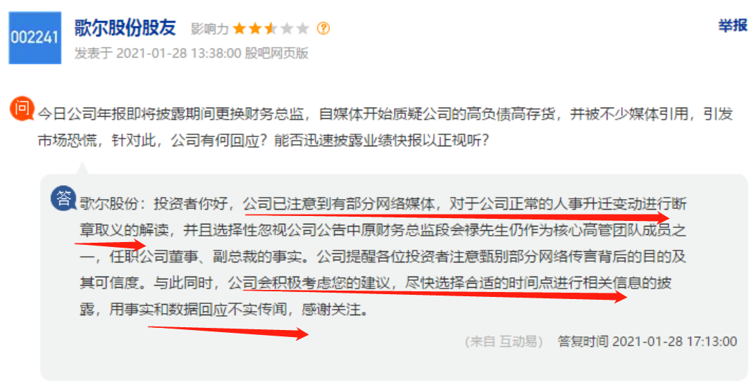歌尔股份对此回应称,公司已注意到有部分网络媒体,对于公司正常的人事升迁变动进行断章取义的解读,并且选择性忽视公司公告中原财务总监段会禄先生仍作为核心高管团队成员之一,任职公司董事、副总裁的事实。公司同时表示,尽快选择合适的时间点进行相关信息的披露,用事实和数据回应不实传闻。