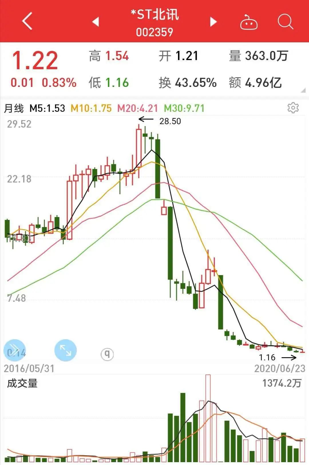从年报披露的数据来看,截至5月底公司拥有股东户数为37466户。*ST北讯6月23日收盘时,股价创出了历史最低价1.16元。这一价格仅为公司2018年2月28日创出的历史最高价28.5元(复权价)的4%,两年多时间,近300亿市值已灰飞烟灭。