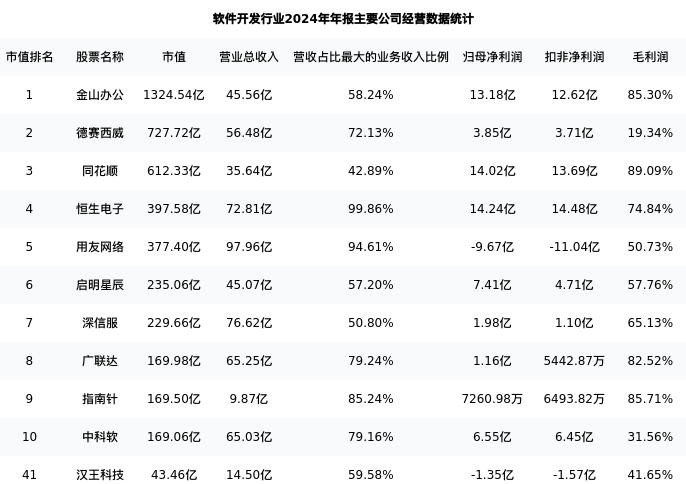 汉王科技最新报告期数据为年报,下表汇总了软件开发行业内市值靠前的公司年报主要经营数据