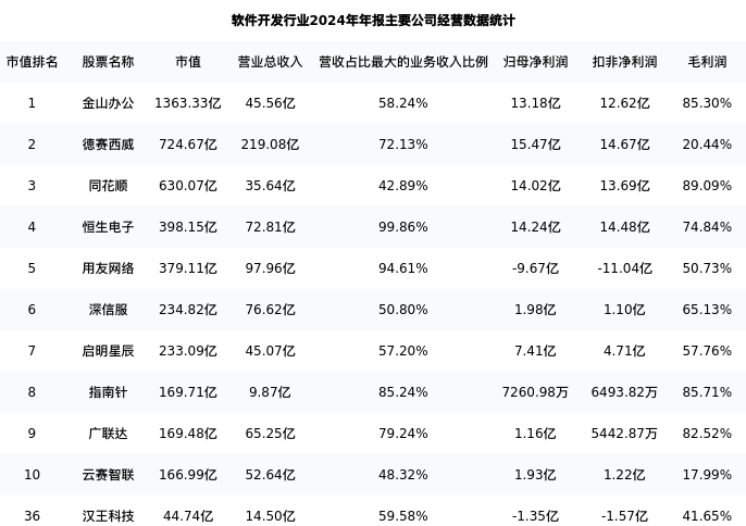 汉王科技最新报告期数据为年报,下表汇总了软件开发行业内市值靠前的公司年报主要经营数据