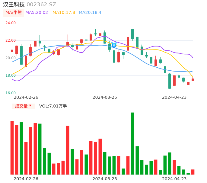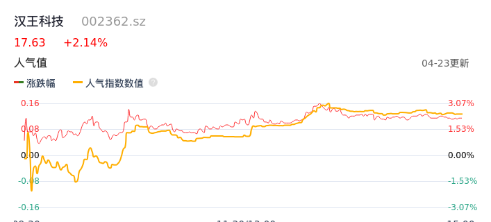 04月23日,汉王科技收报17.63,股价涨幅2.14%,成交金额1.23亿元,换手率3.39%。
