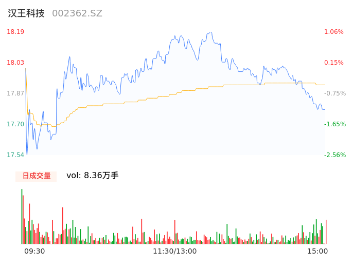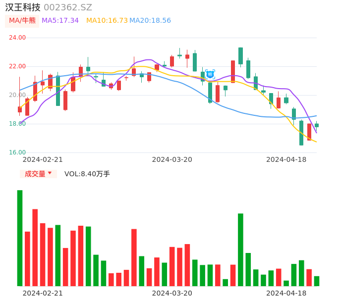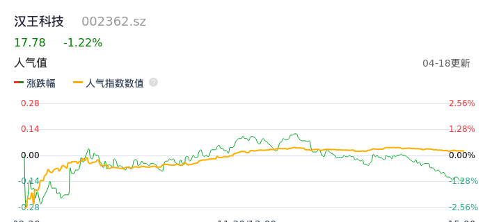 04月18日,汉王科技收报17.78,股价涨幅-1.22%,成交金额1.50亿元,换手率4.06%。