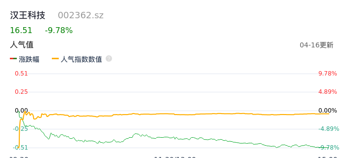 04月16日,汉王科技收报16.51,股价涨幅-9.78%,成交金额2.35亿元,换手率6.67%。