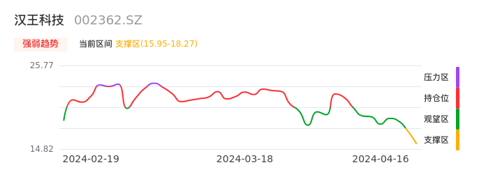 我们来看一下该股的九方特色指标强弱趋势的情况:汉王科技近日从观望区进入支撑区。股价出现一波快速下跌行情,目前下跌动能仍未衰竭。建议继续谨慎观望。注意今日下方支撑位:15.95元,如有效跌破将可能出现新一轮下跌