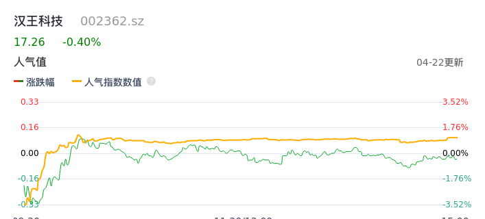 04月22日,汉王科技收报17.26,股价涨幅-0.40%,成交金额9701.29万元,换手率2.73%。