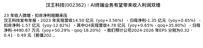 值得注意的是:2024年04月华泰证券的谢春生分析师,首次发布关于汉王科技的研究报告,标题为:汉王科技(002362):AI终端业务有望带来收入利润双增。