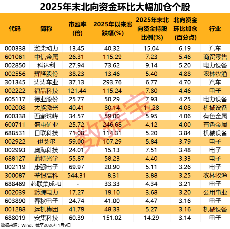 从持股比例(持股数量占流通A股比例)环比变动来看,超半数陆股通成份股2025年第四季度获北向资金环比加仓。21只个股加仓超过3个百分点,主要分布于电子、机械设备、有色金属等行业。