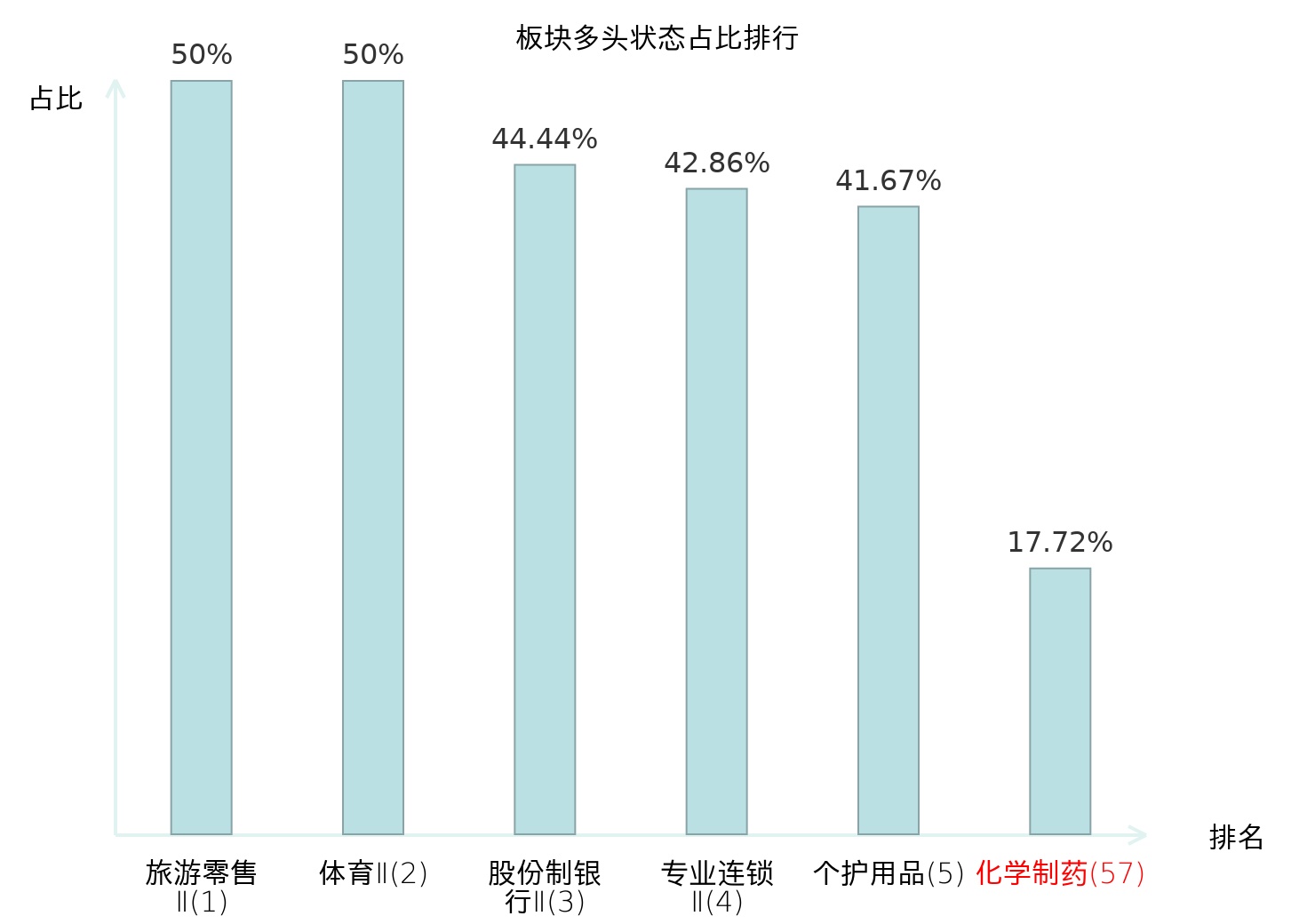 全市场所有行业板块中主力多头状态占比排名中,旅游零售Ⅱ板块位居第一。贵金属板块名次提升最快,较昨日上升83位。