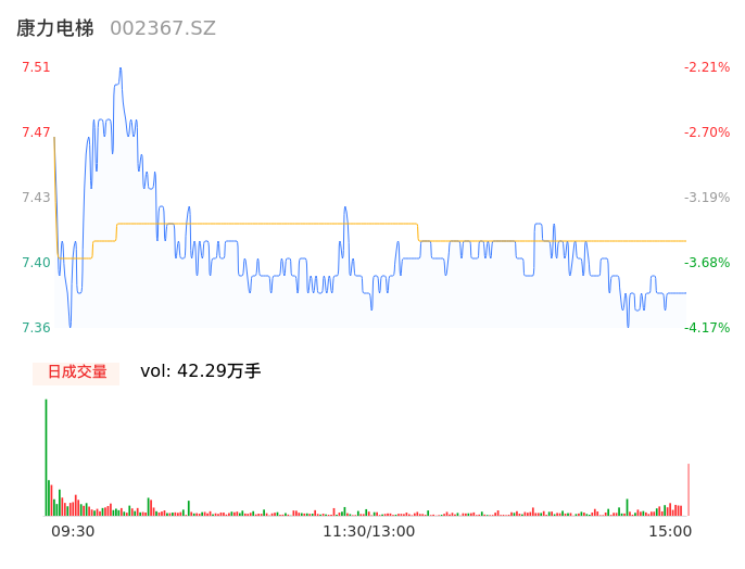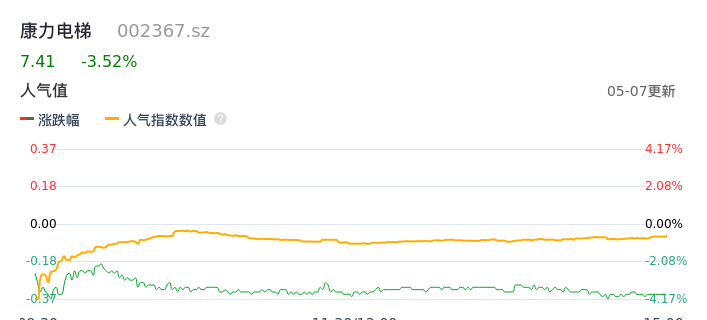 05月07日,康力电梯收报7.41,股价涨幅-3.52%,成交金额3.13亿元,换手率8.03%。