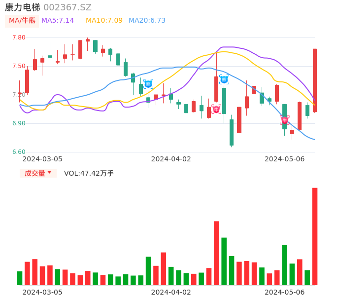 05月06日,康力电梯收报7.68,股价涨幅10.03%,成交金额3.57亿元,换手率9.00%。
