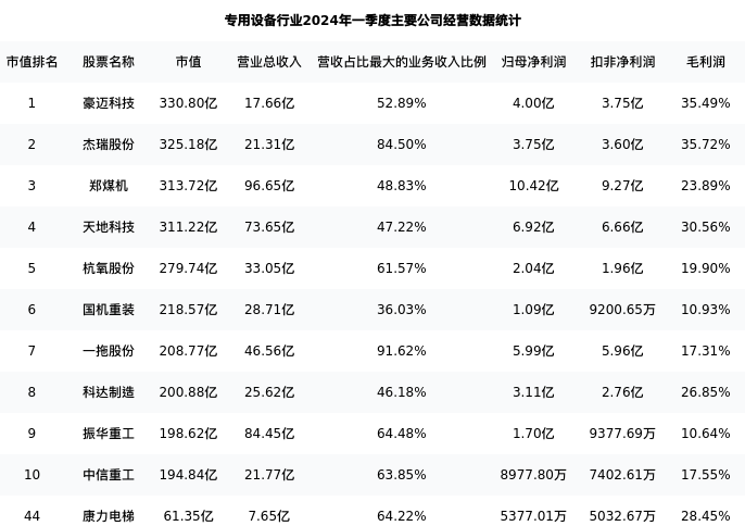康力电梯最新报告期数据为一季度,下表汇总了专用设备行业内市值靠前的公司一季度主要经营数据