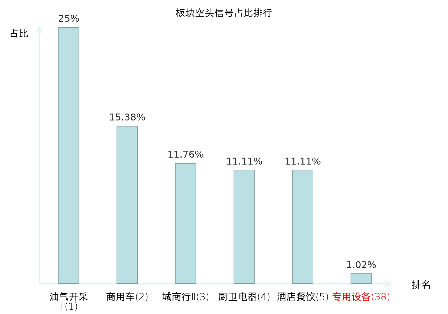 全市场所有行业板块中主力空头信号占比排名中,油气开采Ⅱ板块位居第一。包装印刷板块名次提升最快,较昨日上升101位。
