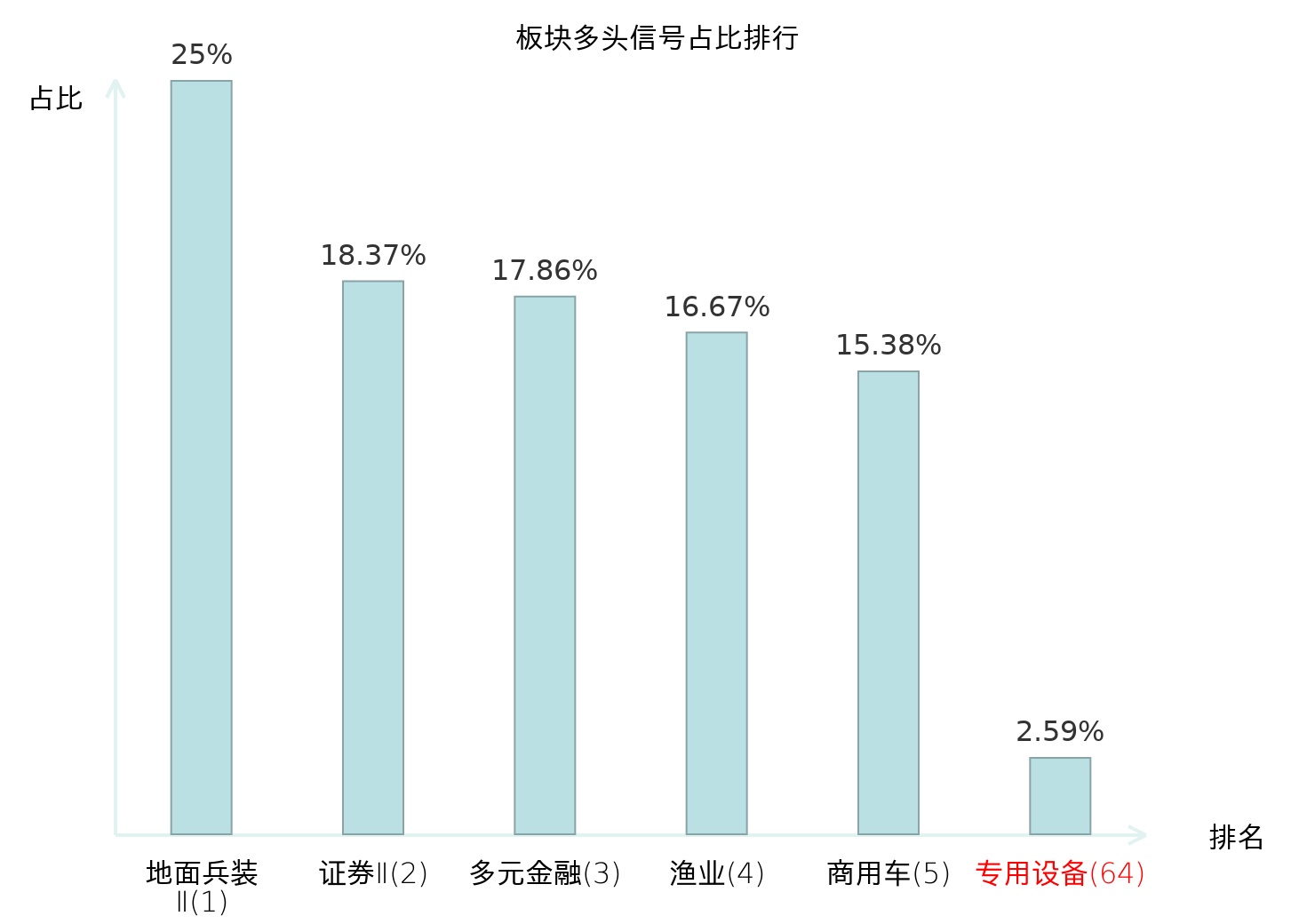 全市场所有行业板块中主力多头信号占比排名中,地面兵装Ⅱ板块位居第一。渔业板块名次提升最快,较昨日上升119位。