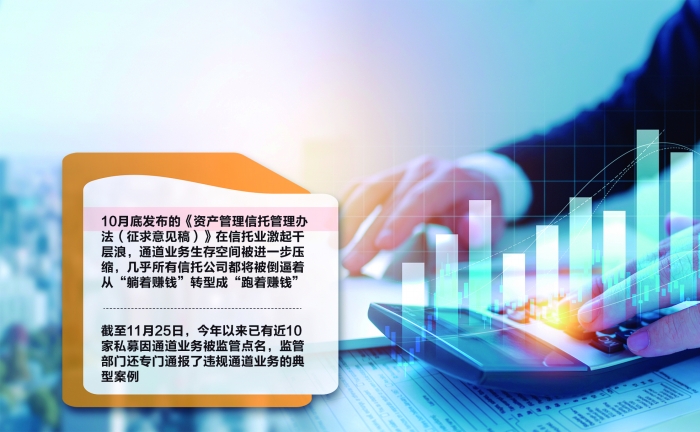同样面临通道压缩的,还有私募行业。公开资料显示,截至11月25日,今年以来已有近10家私募因通道业务被监管点名,监管部门还专门通报了私募基金违规通道业务的典型案例。在业内人士看来,通道业务本就存在权责不明、监管套利等风险,不管是私募还是信托都不应做一个“借路人”,要聚焦主业,以投资人利益为先,做好主动管理,才是资管机构应有之义。