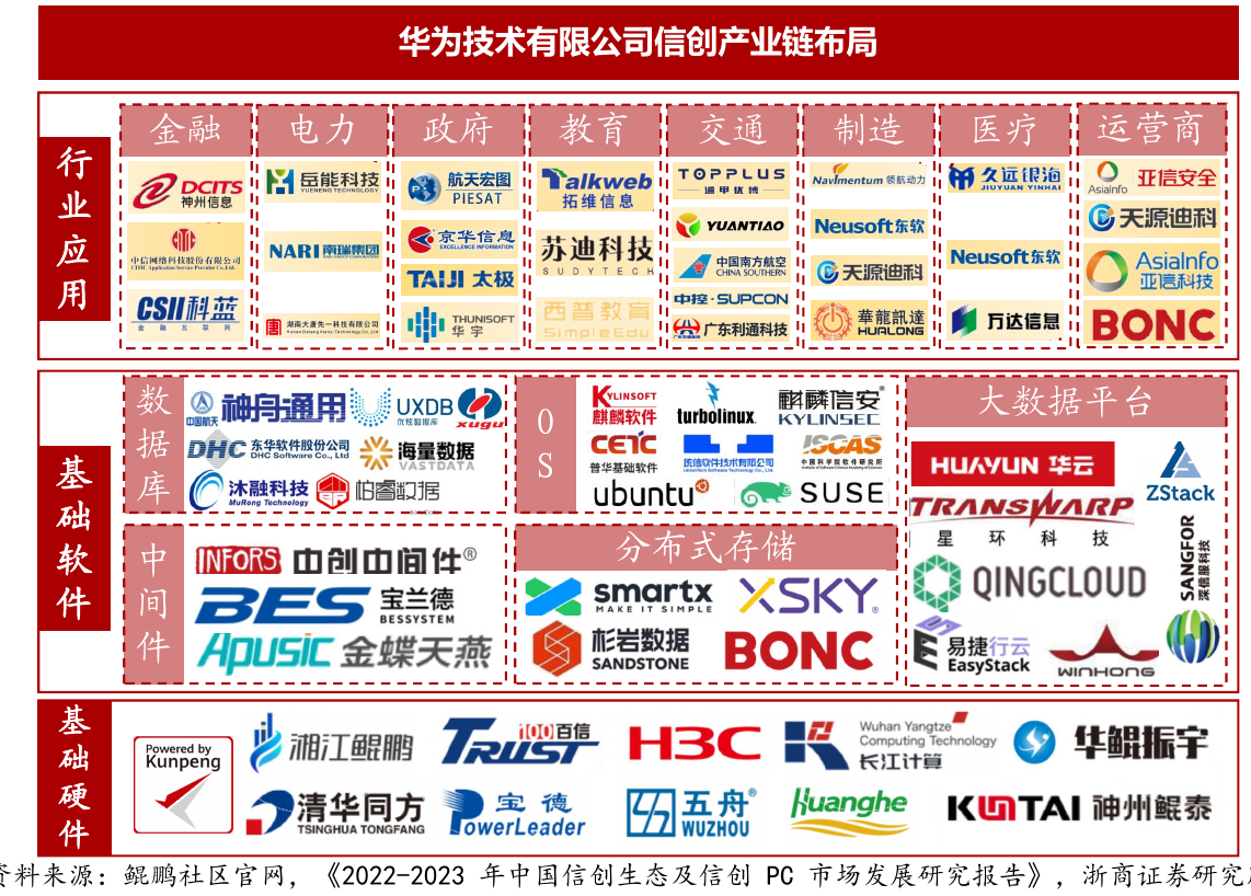 围绕昇腾生态打造AI算力基座。华为昇腾芯片是华为公司发布的两款人工智能处理器,包括昇腾910(用于训练)和昇腾310(用于推理)处理器,采用自研的达芬奇架构,主要是对标英伟达的GPU,以及海光、寒武纪等国内厂商生产的AI芯片产品。从2017年昇腾问世伊始,华为便致力于打造完全自主可控的昇腾人工智能生态,完全基于自研的指令集、独立的算子使能CANN、AI框架昇思MindSpore以及整个工具体系。在当前生成式AI算力需求激增和错综复杂的国际环境交织下,自主可控的AI算力基座显得至关重要。目前国产AI芯片在产品性能和软件生态等方面与国际领先水平还存在差距,意味着未来相关市场空间更大。基于鲲鹏处理器的硬件产品种类丰富,产品已相对成熟。目前已经有11家整机制造厂商加入到鲲鹏计算生态中,市面上目前已经存在27款不同厂商生产的整机设备,每种型号的设备的性能都各具特色,可以基本满足信创产品对硬件设备的性能要求。