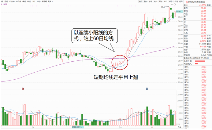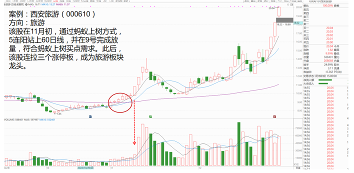 所谓蚂蚁上树是指当短期均线系统在底部走平,股价站上短期均线系统后,以连续上攻的小阳线缓步盘升,把股价轻松送上中期压力线(一般指60日线,或前平台高点)。