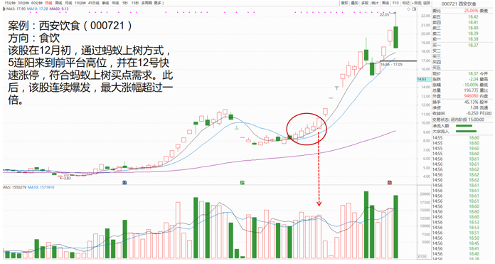 我们把这几根持续上升的小阳线称为“蚂蚁上树”。我们举个例子来展示一下: