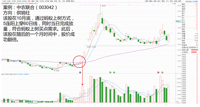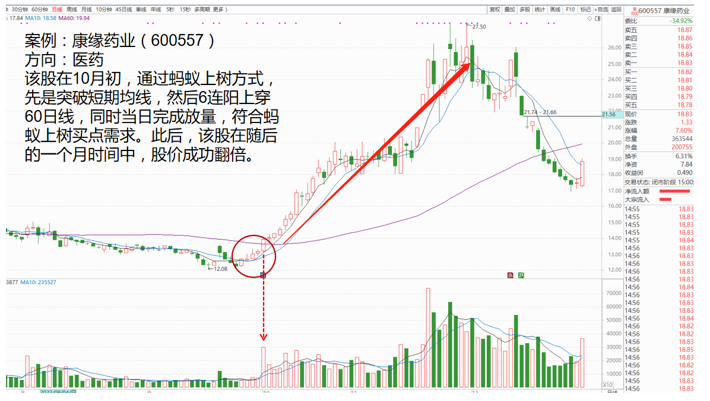 在9月28号的时候,股价站上短期均线系统,然后以小阳线的形式缓步将股价推升至中期均线上方。那么9月28号至10月12号这六根小阳线,就是蚂蚁上树形态。