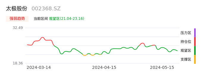 我们来看一下该股的九方特色指标强弱趋势的情况:太极股份自05月08日从持仓区下穿到观望区,股价近期持续走弱。短期已经进入空头行情,且下跌动能仍未衰竭。建议继续谨慎观望。