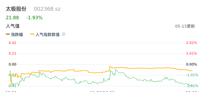 05月15日,太极股份收报21.88,股价涨幅-1.93%,成交金额1.43亿元,换手率1.05%。
