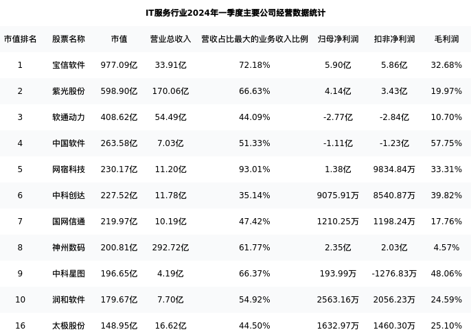 太极股份最新报告期数据为一季度,下表汇总了IT服务行业内市值靠前的公司一季度主要经营数据