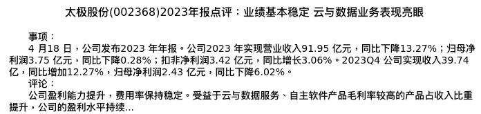 值得注意的是:2024年04月华创证券的吴鸣远分析师,首次发布关于太极股份的研究报告,标题为:太极股份(002368)2023年报点评:业绩基本稳定 云与数据业务表现亮眼。