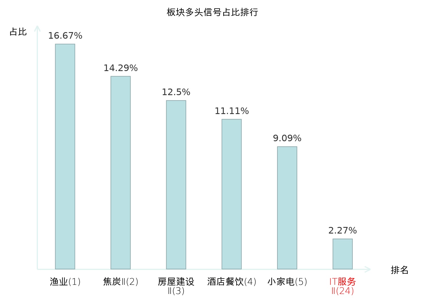 全市场所有行业板块中主力多头信号占比排名中,渔业板块位居第一。渔业板块名次提升最快,较昨日上升121位。