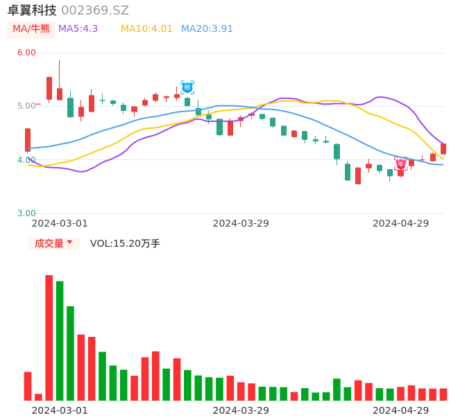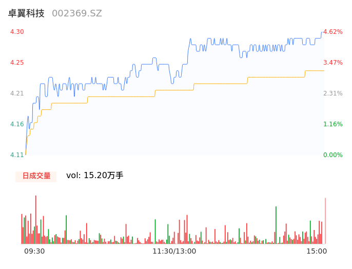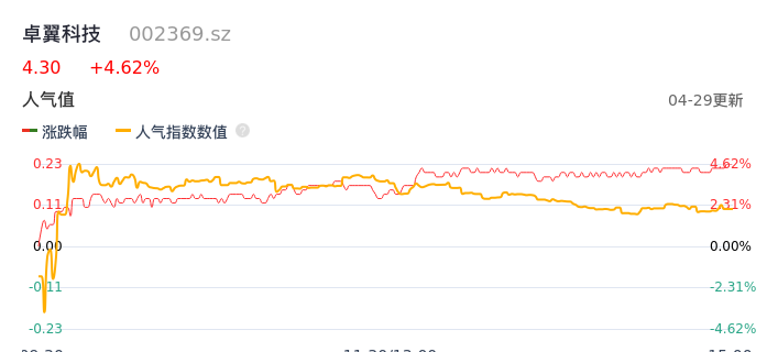 04月29日,卓翼科技收报4.30,股价涨幅4.62%,成交金额6448.07万元,换手率2.69%。