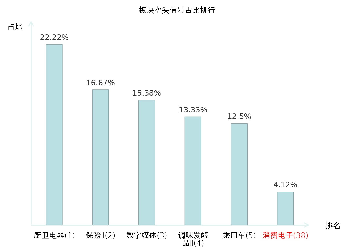 全市场所有行业板块中主力空头信号占比排名中,厨卫电器板块位居第一。教育板块名次提升最快,较昨日上升105位。