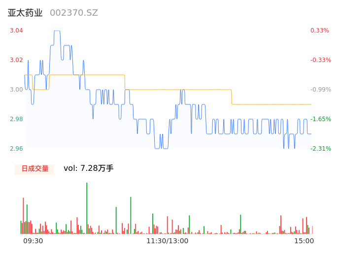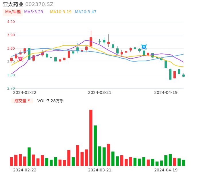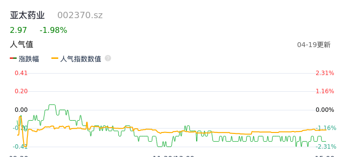 04月19日,亚太药业收报2.97,股价涨幅-1.98%,成交金额2176.28万元,换手率1.19%。