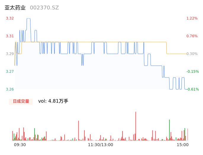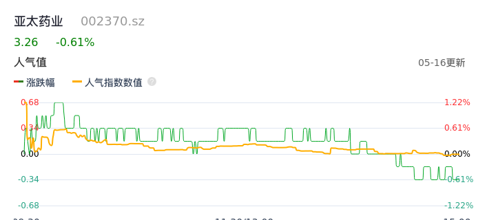 05月16日,亚太药业收报3.26,股价涨幅-0.61%,成交金额1581.82万元,换手率0.79%。