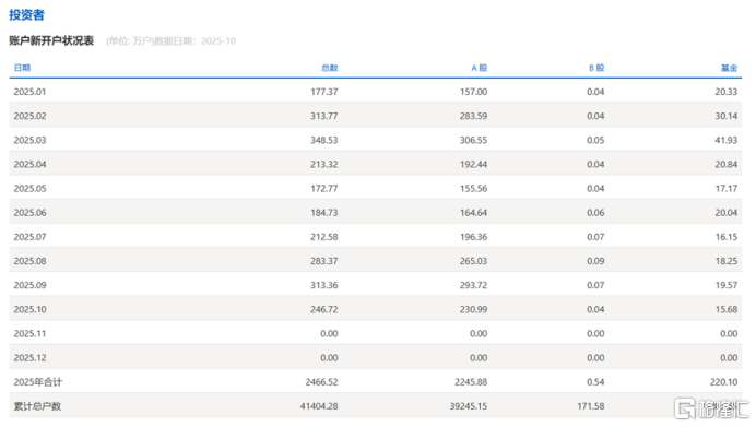 2025年10月A股新开户231万户,同比去年10月的685万户下降66%,环比9月下降21%,主要受假期和股市震荡影响;前10个月已累计新开2246万户,同比增长11%。此前开户数在3月突破300万户,4月因关税摩擦环比大降,6月起持续回升态势在10月中断。