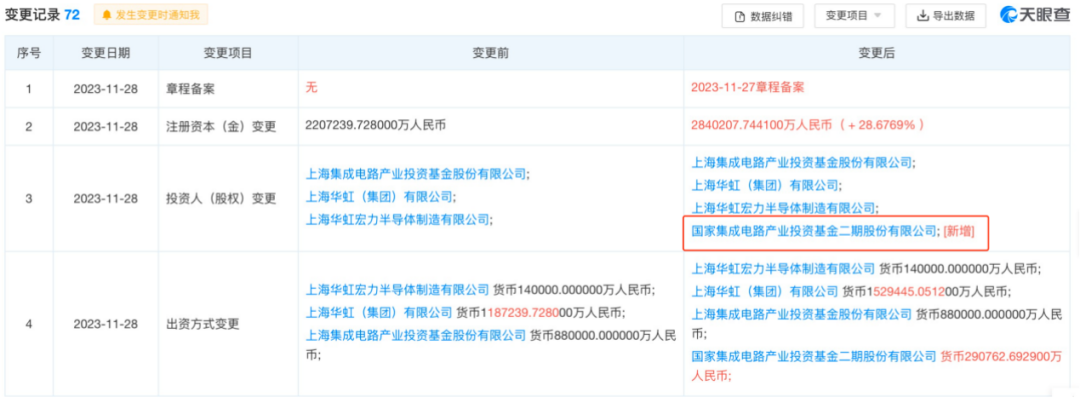 天眼查APP显示,近日,上海华力微电子有限公司(以下简称“华力微”)发生工商变更,新增大基金二期为股东,同时,公司注册资本由约220.7亿元人民币增至约284亿元人民币,增幅约28.68%。