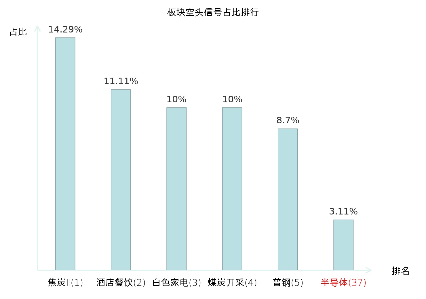 全市场所有行业板块中主力空头信号占比排名中,焦炭Ⅱ板块位居第一。生物制品板块名次提升最快,较昨日上升113位。