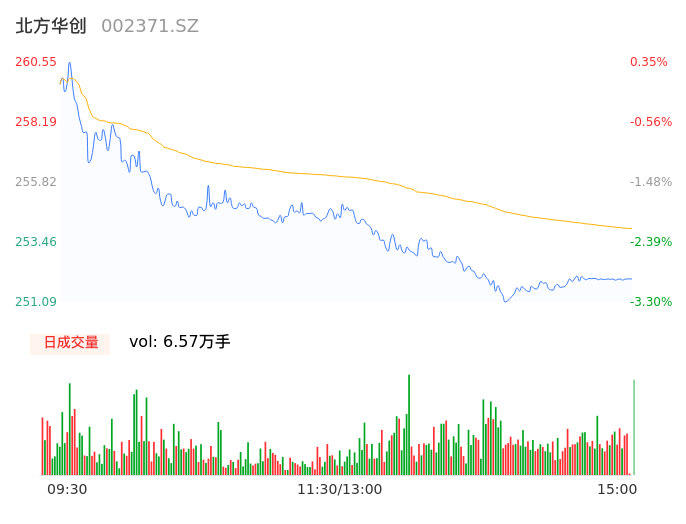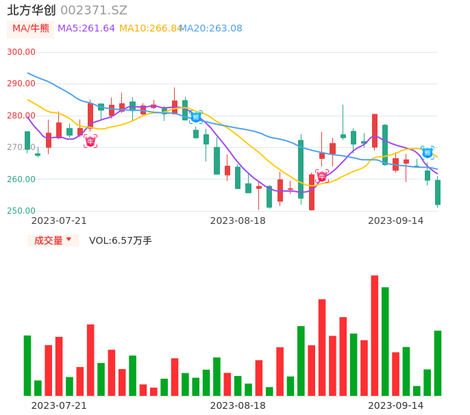 09月14日,北方华创收报251.96,股价涨幅-2.96%,成交金额16.70亿元,换手率1.24%。