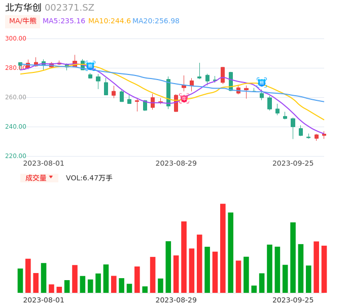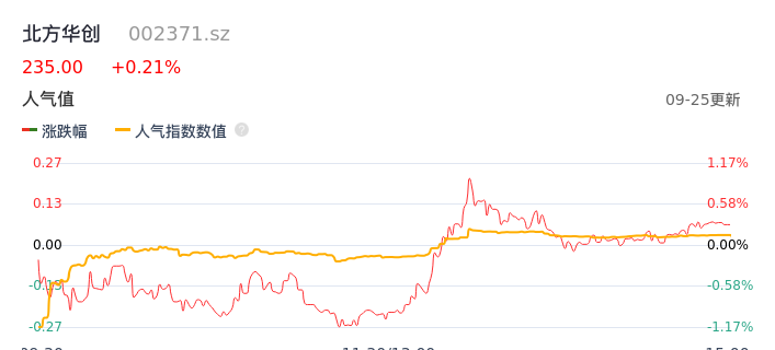 09月25日,北方华创收报235.00,股价涨幅0.21%,成交金额15.15亿元,换手率1.23%。