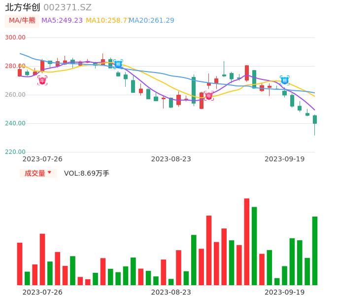 09月19日,北方华创收报239.90,股价涨幅-2.27%,成交金额20.65亿元,换手率1.64%。